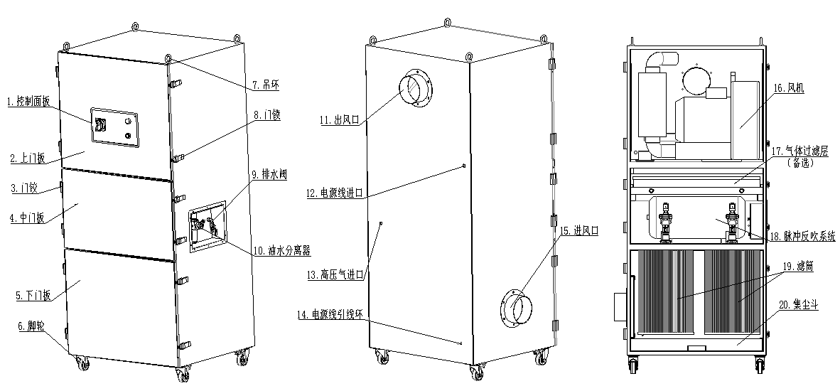 SRA-950XP脈沖反吹清灰凈化機高壓風(fēng)機和三層過濾系統(tǒng)組合而成。