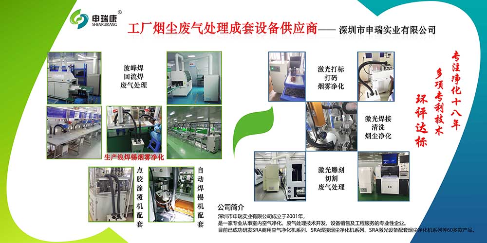 申瑞研發(fā)與生產(chǎn)的專業(yè)針對工業(yè)煙塵廢氣處理及成套設(shè)備,廣泛應(yīng)用于激光加工、波峰焊、回流焊、點膠等領(lǐng)域,凈化率達到99.99%,是您環(huán)評環(huán)保達標的首選。